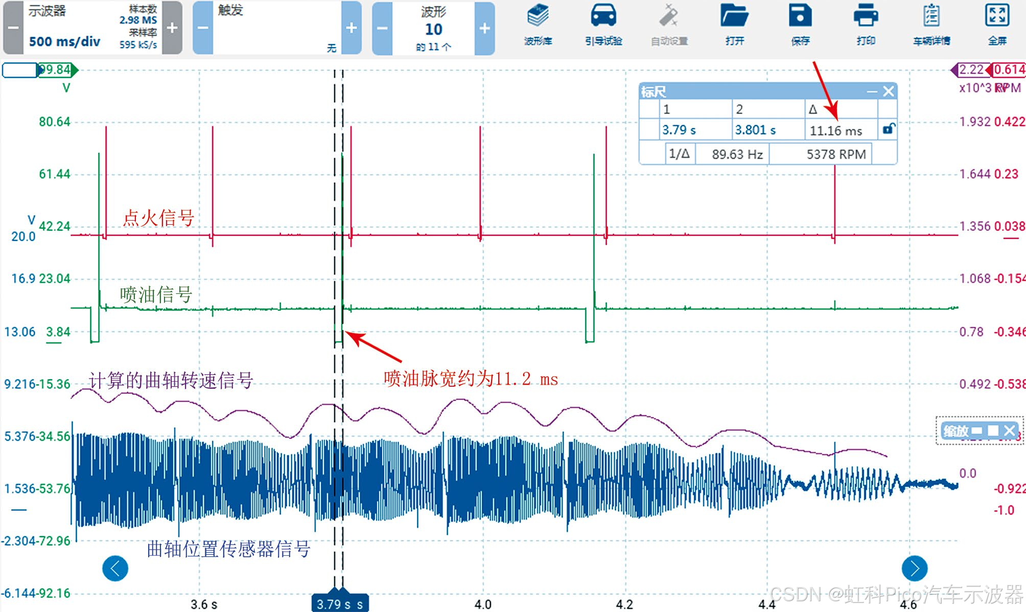 用故障检测仪检测,无相关故障代码存储。用虹科Pico汽车示波器测量点火、喷油及曲轴位置传感器信号波形,反复试车,捕捉到发动机自动熄火时的相关波形如图1所示。