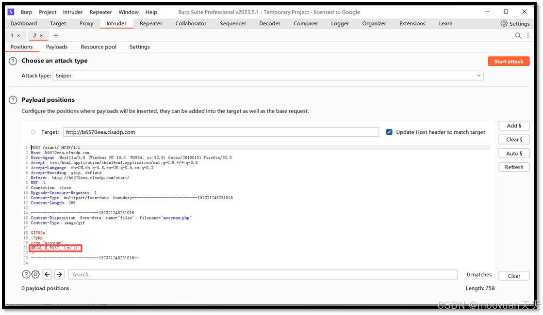 对上传的文件名mooyuan.php的后缀php选中并点击add,效果如下所示,添加完毕后左下角的payload数量变为1。