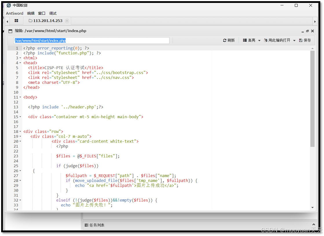 新建一个存放着一句话木马的php文件,脚本名为mooyuan.php。这段GIF89a文件头后嵌入PHP代码的文本,是一个伪装成GIF图片的WebShell后门。它利用图片文件头"GIF89a"绕过安全检查,当服务器被配置为将.gif文件解析为PHP时(如通过.htaccess设置),该文件就会被执行。其中的eval($_POST['ljn'])函数允许攻击者通过POST请求执行任意PHP代码,从而完全控制服务器,构成严重的安全威胁。