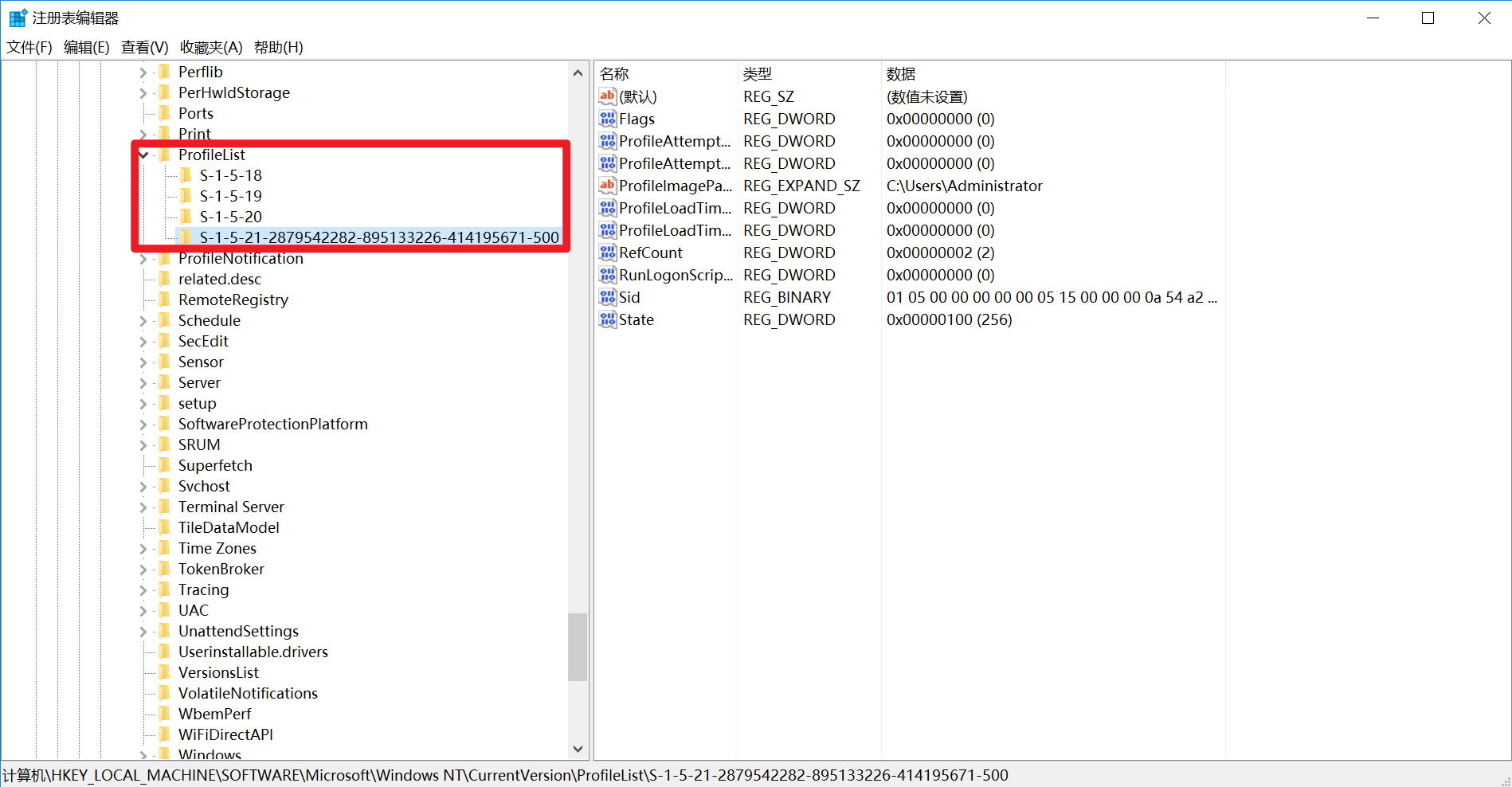 •导航到路径:HKEY_LOCAL_MACHINE\SOFTWARE\Microsoft\Windows NT\CurrentVersion\ProfileList,在该目录下的子项名称即为对应用户的 SID