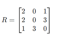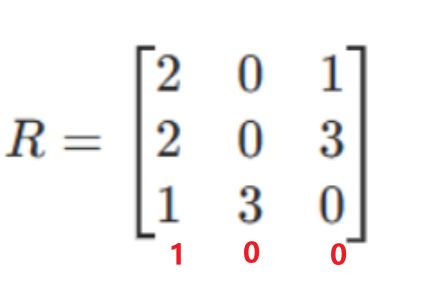 R = [ 7 0 5 6 3 1 0 4 4 7 0 7 3 2 5 0 ] R = \begin{bmatrix} 7 & 0 & 5 & 6 \\ 3 & 1 & 0 & 4 \\ 4 & 7 & 0 & 7 \\ 3 & 2 & 5 & 0 \\ \end{bmatrix} R= 7343017250056470