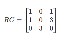 R C = [ 4 0 5 6 0 1 0 4 1 7 0 7 0 2 5 0 ] RC = \begin{bmatrix} 4 & 0 & 5 & 6 \\ 0 & 1 & 0 & 4 \\ 1 & 7 & 0 & 7 \\ 0 & 2 & 5 & 0 \\ \end{bmatrix} RC= 4010017250056470