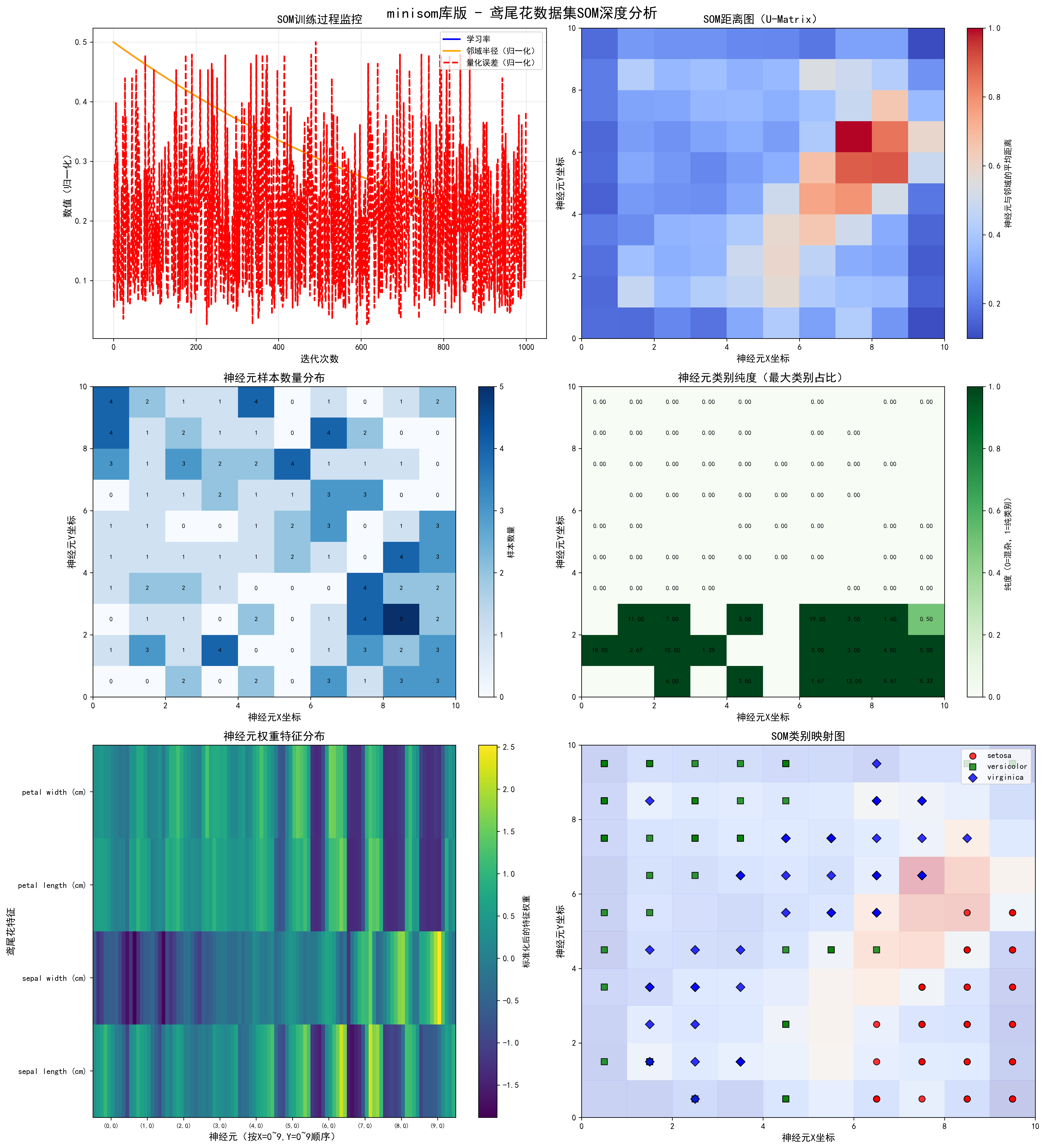 print("2. minisom库版SOM可视化图表(som_minisom_iris.png)")