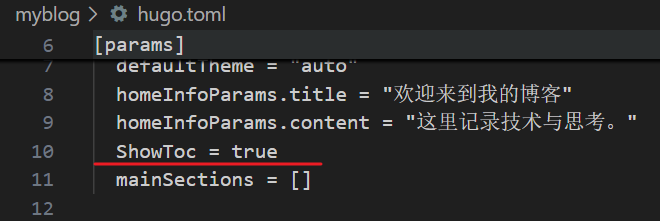 OK,分析完这些,可以知道,Hugo PaperMod 模板本身已经提供了一套 TOC 机制,下面只要应用即可,打开 hugo.toml 配置文件,加入配置项 ShowToc = true