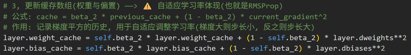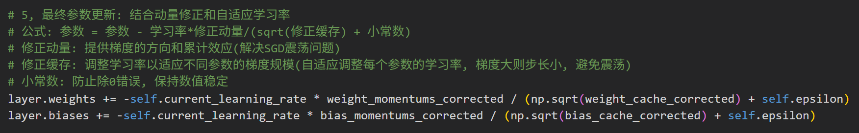 代码里的weight_momentums:就是记录"惯性"的小本本。首次更新时(我们刚起步),还没有任何惯性,所以用全0数组初始化(小本本是空白的),之后每走一步,就把"当前坡度+之前惯性"记到这个小本本里。