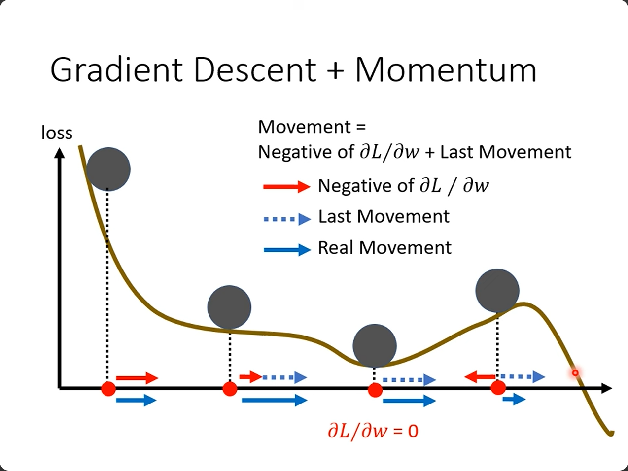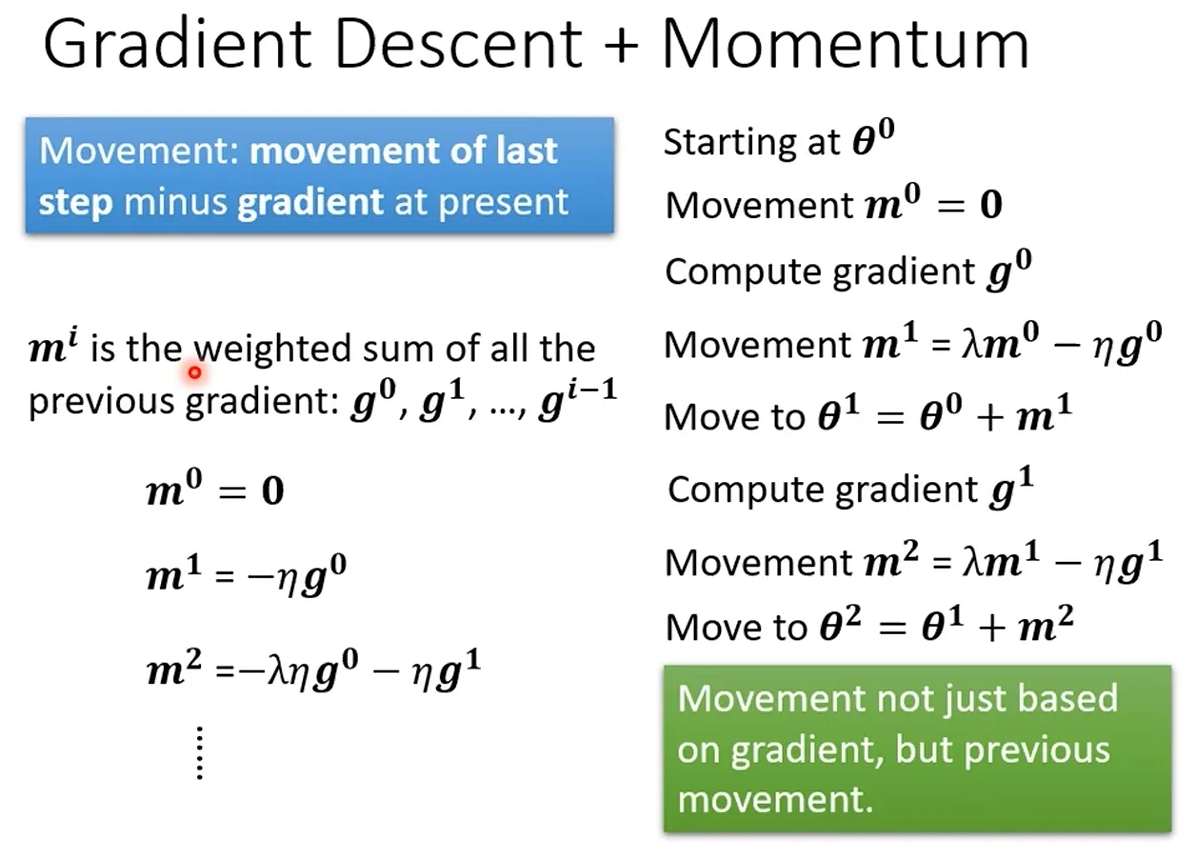 - 动量=我们"之前走的方向的积累"(比如前几步一直往西南走,就有了西南方向的惯性);