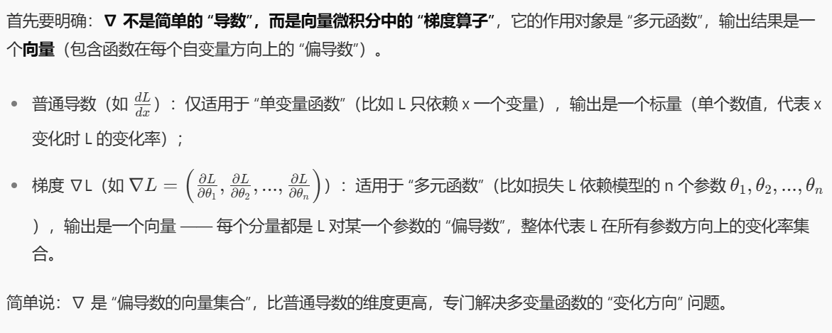 - ∇L(当前梯度)= 我们脚下的"坡度方向"(比如脚下路往东北斜,梯度方向就是东北,我们往反方向西南走);