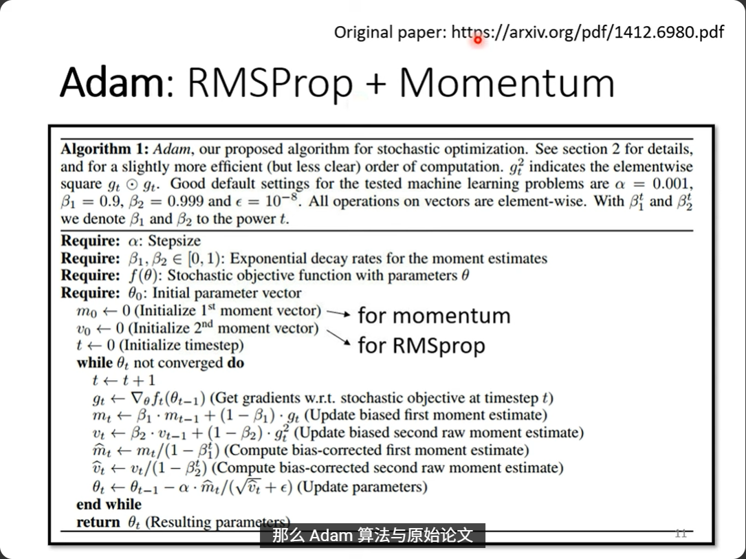 讲完了动量法和RMSProp,我们再来看一下现在深度学习常用的优化算法,也就是SGD的一个优化版本,Adam算法,实际上就是RMSProp(自适应学习率)+动量法(考虑历史梯度),