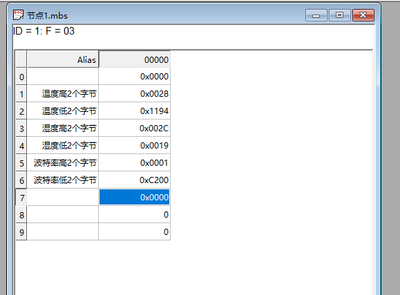 配置modbus slave传输内容,通过前面操作其ID号,将寄存器内容栏设置为16进制,其中温湿度寄存器高2位为小数点前数据,低两位为小数点后数据。