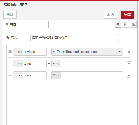 配置好modbus-red节点后,从左侧面板将一个inject节点拖入工作区。因为采集的modbus_slave分别有温度、湿度两组数据,使用需要在inject节点中添加两个节点,分别取名为msg.temp和msg.humi。