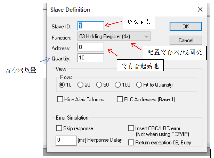 点击setup->Slave Definition,进入配置界面,参照下图对modbus_slave进行配置。