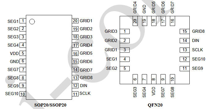 | 13-20 | GRID1-8 | O | 位选(共阴),300 mA灌入能力 |