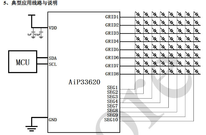 关断漏电:SEG<1 µA,GRID<10 µA,待机<5 µA;