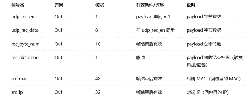 当最后一个 payload 字节输出结束后,udp_rx 产生单周期结束指示 rec_pkt_done ,作为上层"锁存长度/地址、追加、触发发送"的关键时序基准;同时地输出对端址信息 src_mac[47:0] 与 src_ip[31:0],供回包时作为目的地址使用。