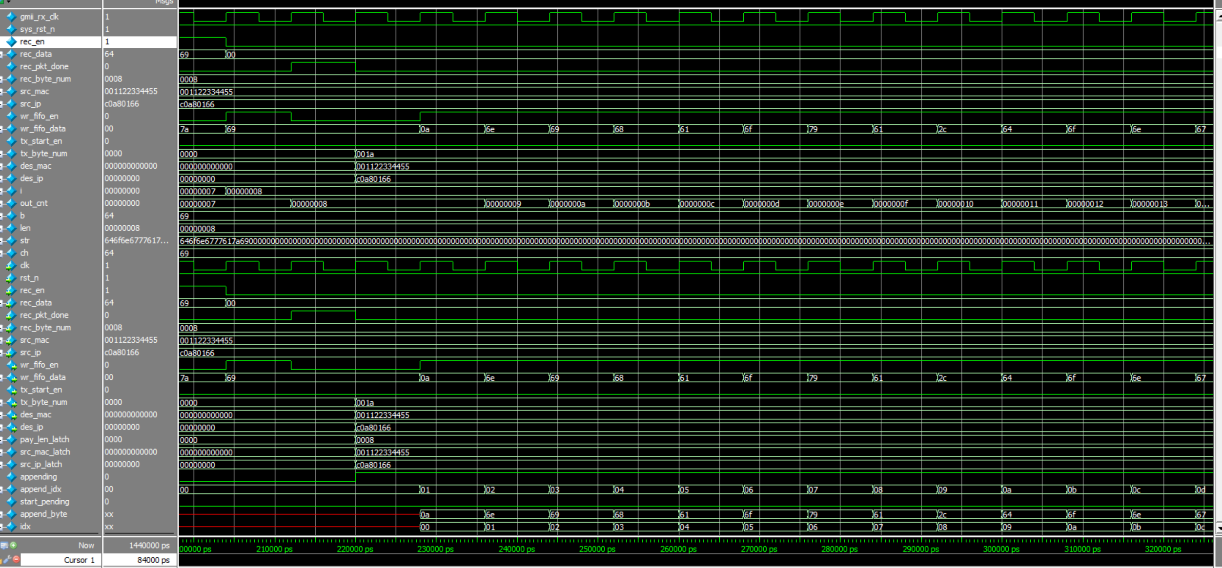 就图2可见,在 rec_pkt_done 到来后,模块首先锁存源地址信息(src_mac/src_ip=>desmac/ip)并启动追加过程。追加数据在 wr_fifo_data 上依次输出: