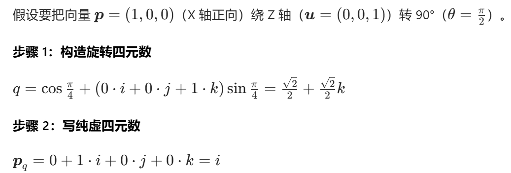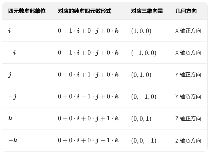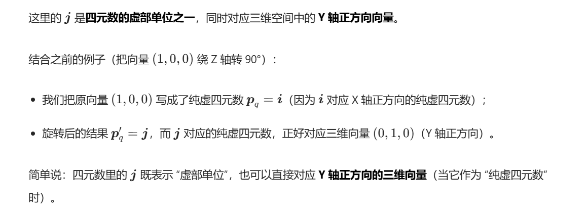 - 形式 2:纯虚四元数:若 w=0,则 q=v=xi+yj+zk(可直接对应三维向量)。
