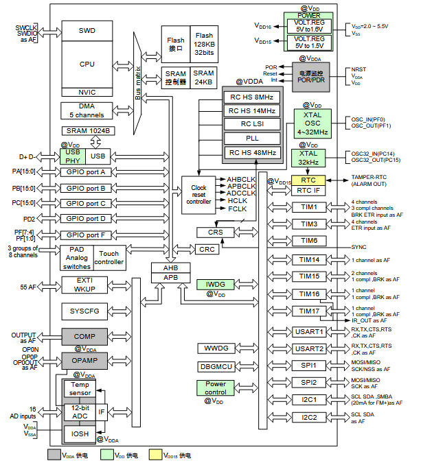 USB 应用时,VDD 范围 2.0~3.6 V,超出必须 LDO;否则 D+/D- 眼图失败。