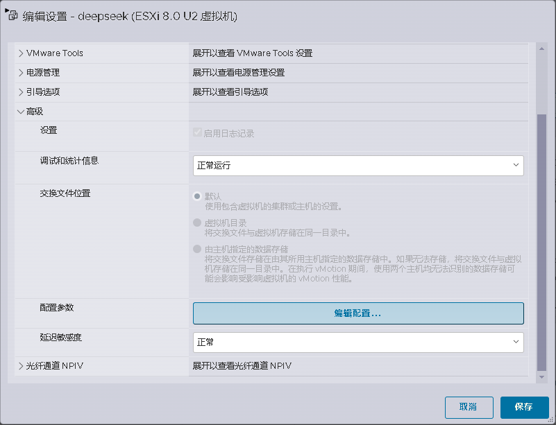 "虚拟机选项"------"高级"------"配置参数"------"编辑配置",将如下的"参数 值"一一添加。