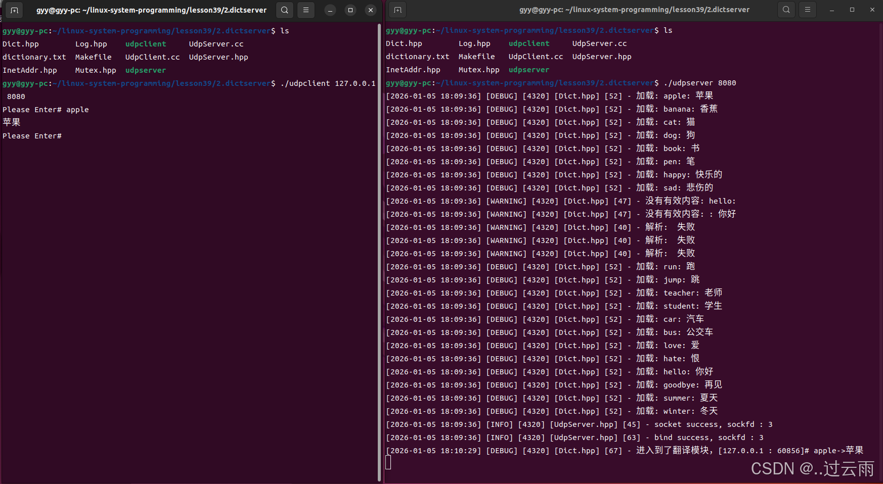 ./udpserver 8080之后,首先加载字典到内存中,字典中有问题的单词翻译会解析失败 - 另开一个终端运行