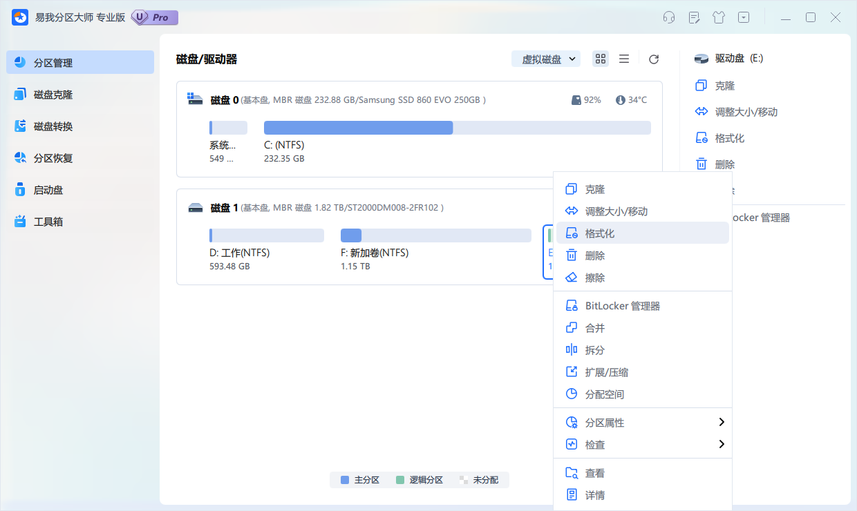 对于需要更精准控制格式化过程、处理复杂分区问题(如坏道分区、大容量硬盘分区)的场景,推荐使用易我分区大师。易我分区大师支持16TB大容量磁盘,兼容多种文件系统,操作步骤清晰,适合新手和专业用户使用。