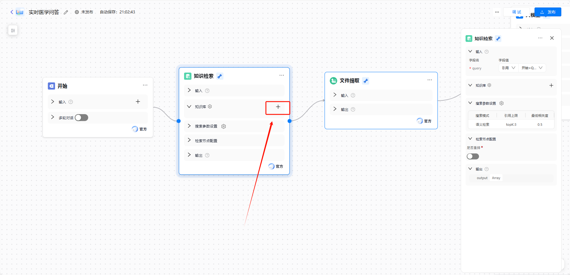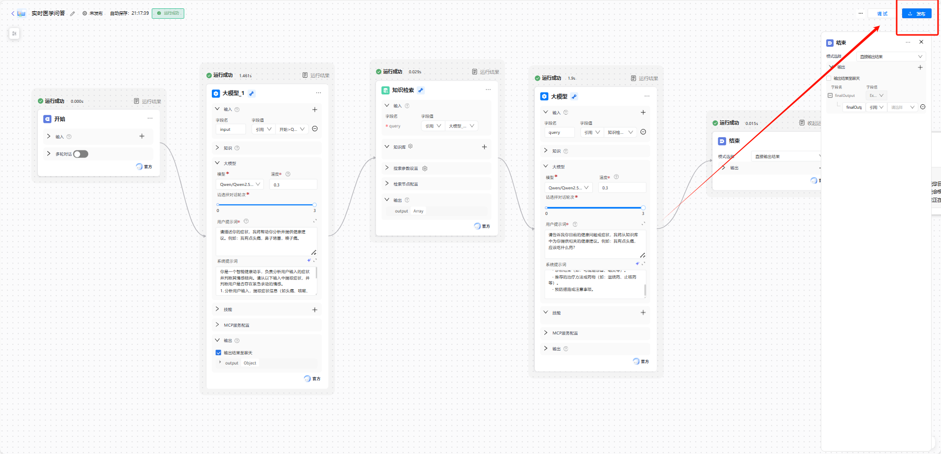 - 知识库检索节点:在上传的医学知识库中检索相关信息。