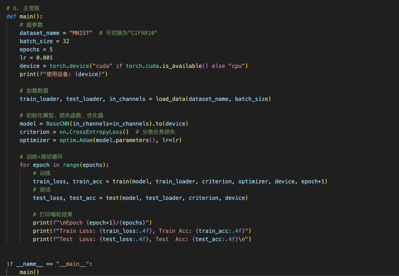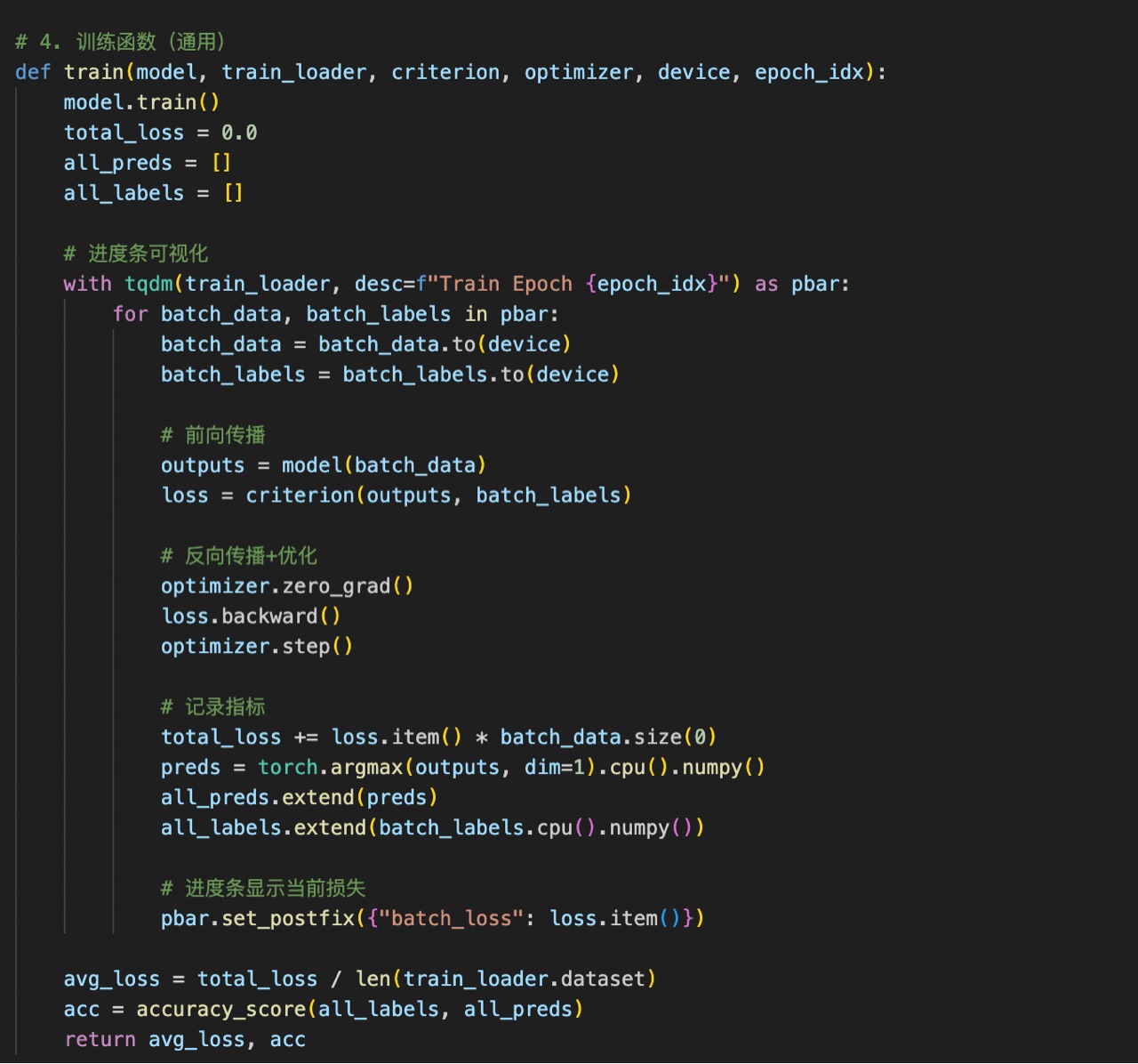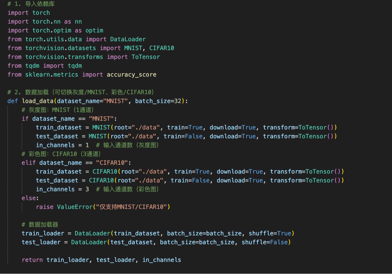 由于彩色图(3 通道)和灰度图(1 通道)的输入格式不同,但训练 / 测试的核心逻辑(前向传播、损失计算、指标评估)是通用的,因此需将训练、测试逻辑封装为独立函数,实现 "一次编写、多场景复用"。