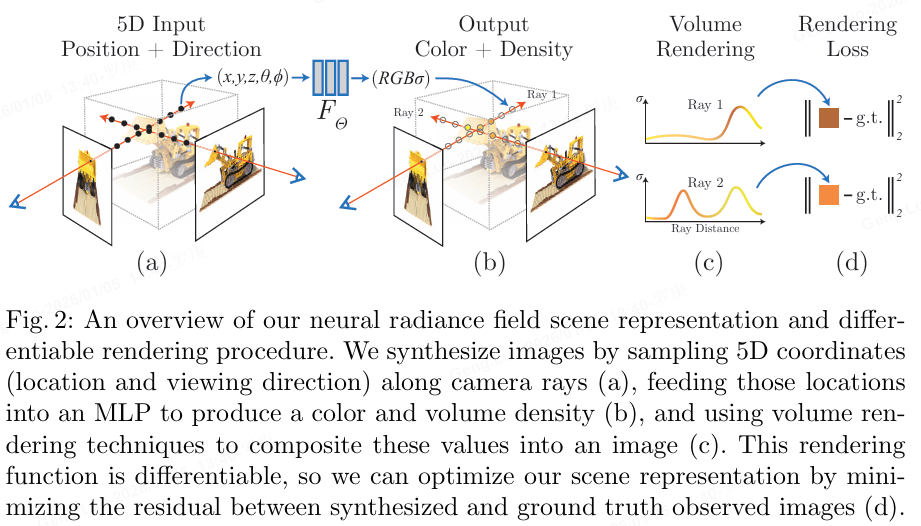 因为神经网络是可微分的,选取的体渲染方法是可微分;体渲染得到的图片和原图计算MSE Loss。整个过程可端到端地用梯度回传来优化非常漂亮。