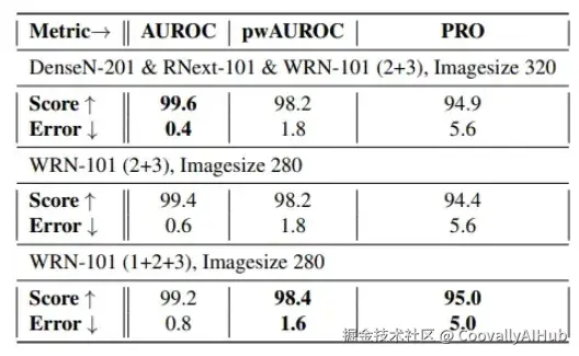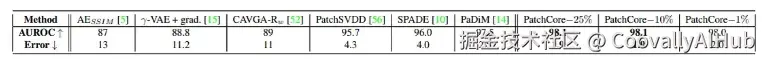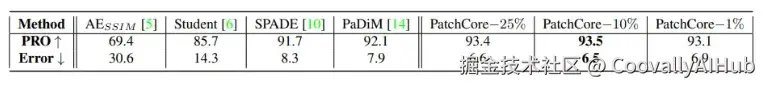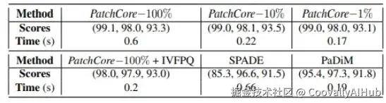 PatchCore在MVTec AD上实现了最先进的图像级异常检测性能。如表1所示,PatchCore达到高达99.1%的AUROC,显著优于PaDiM和SPADE等方法。在像素级AUROC和PRO指标上,PatchCore同样达到了最优性能(表2,表3)。重要的是,其改进版本在更高分辨率图像和集成系统上也能应用,同时保持低于默认版本的推理时间(表4)。