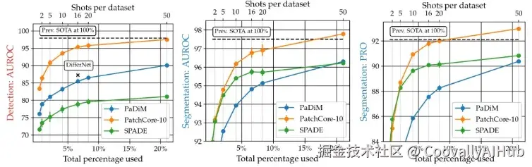 小样本异常检测:如图6所示,PatchCore展现出卓越的样本效率。仅使用20%的正常训练数据,PatchCore就能达到或超过对比方法使用全部数据训练的性能。即使在极端的1-5个训练样本情况下,PatchCore仍具竞争力。