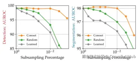 由于精确优化是NP难问题,这里采用了一种贪婪近似算法,迭代地选择距离当前子集最远的特征。为了进一步提升效率,PatchCore应用了随机线性投影,利用Johnson--Lindenstrauss引理在核心集选择期间降低维度。如图3所示,与随机子采样相比,此策略能更有效地保留正常特征分布的结构,使得记忆库规模可以数量级地缩减,而性能损失最小。