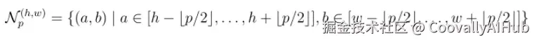 为了增强对小范围空间错位的鲁棒性,同时保持分辨率,PatchCore引入了局部邻域聚合。对于位于空间位置 (h, w) 的一个块,聚合其周围大小为 p 的邻域内的特征: