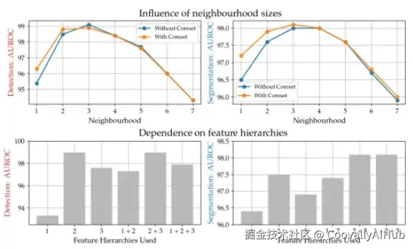 核心集子采样的重要性:图5比较了贪婪核心集子采样与随机子采样等方法。核心集选择始终能更好地保持性能,在某些情况下甚至能提高联合检测和定位的精度。此外,通过增大步幅来缩减记忆库会导致性能下降,这凸显了保持空间分辨率的重要性。
