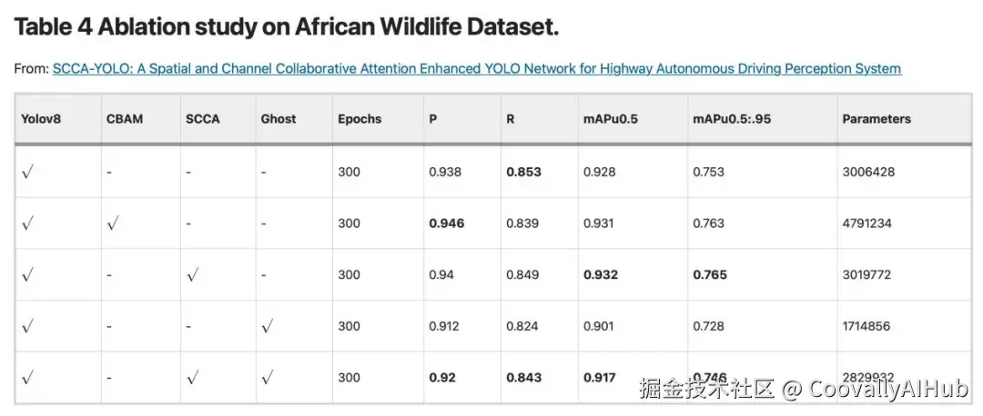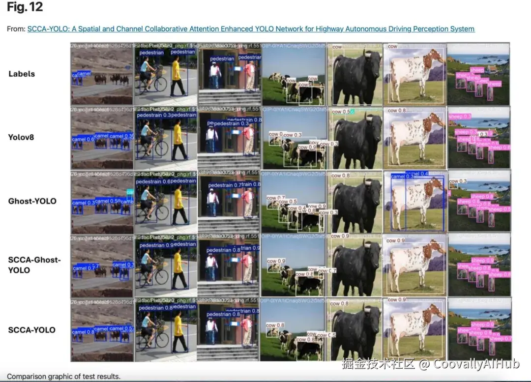 在公开数据集上: 即使在非专门针对乡村道路的数据集上,SCCA-YOLO也表现出了优秀的泛化能力。在African-Wildlife数据集上,网络展现了对各种野生动物出色的识别能力;在COCO128数据集上的表现也优于其他对比方法。
