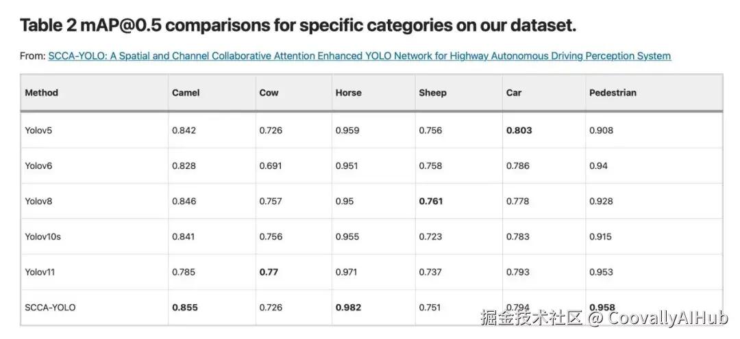 在自有数据集上: SCCA-YOLO相比传统YOLOv8在平均精度均值上提升了1.6%,比采用卷积块注意力模块的YOLOv8变体高出0.7%。特别值得注意的是,在检测大型动物等乡村道路特有目标时,性能提升更为明显。