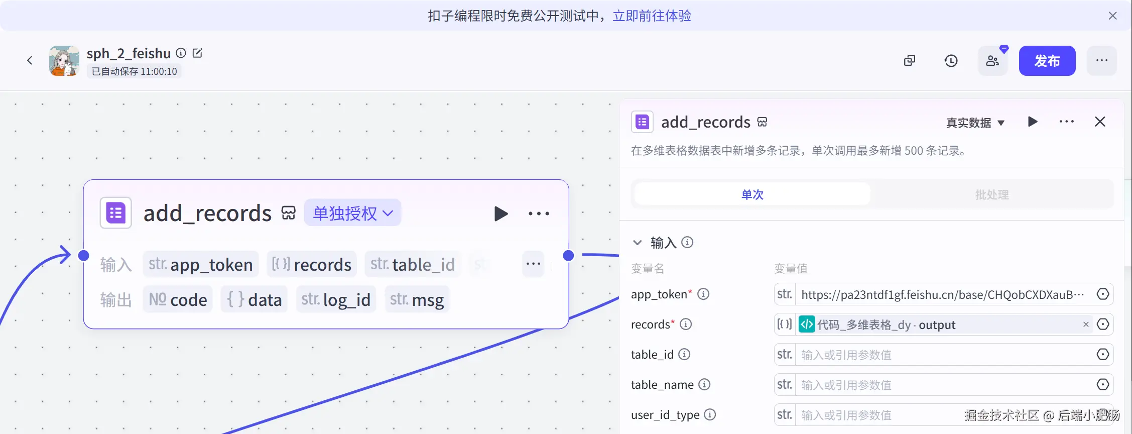 add_records: 这是飞书插件,在app_token处填写表格链接,在records处输入前置代码节点的生成结果。