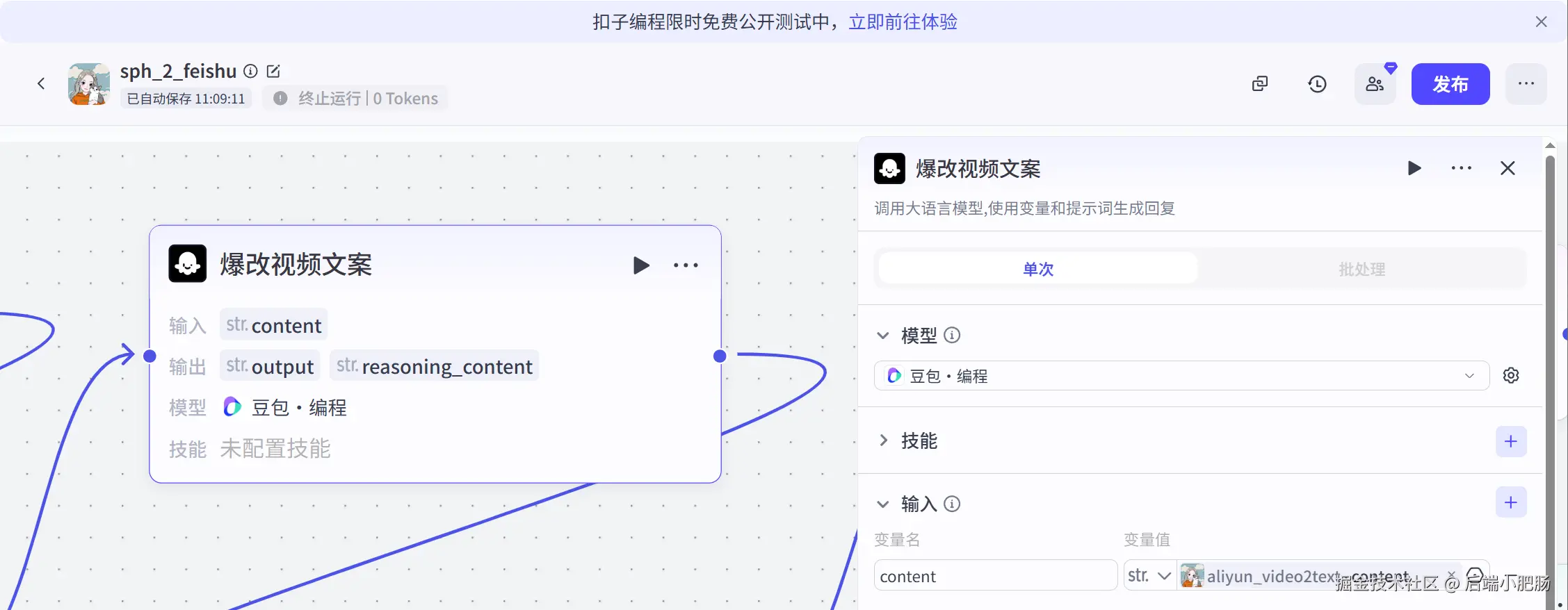 二创文案(大模型): 这是一个大模型节点,采用豆包编程模型,它的作用是对原始文案进行二创改写生成新的文案。相关提示词我已整理到提示词模板当中,需要的文末领取。