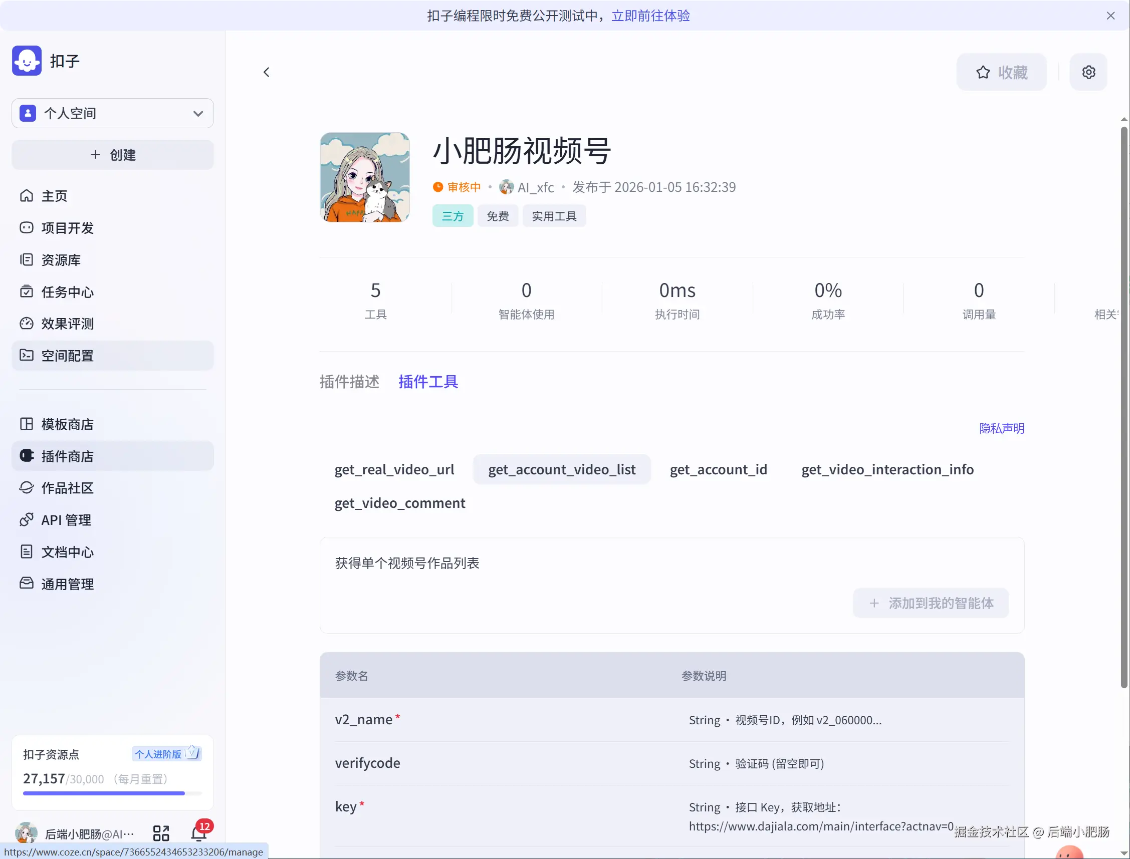 基于阿里云百炼模型提取文案: 这也是我开发的插件,插件市场搜索小肥肠即可找到并使用。它的作用是根据真实的视频地址提取文案内容。