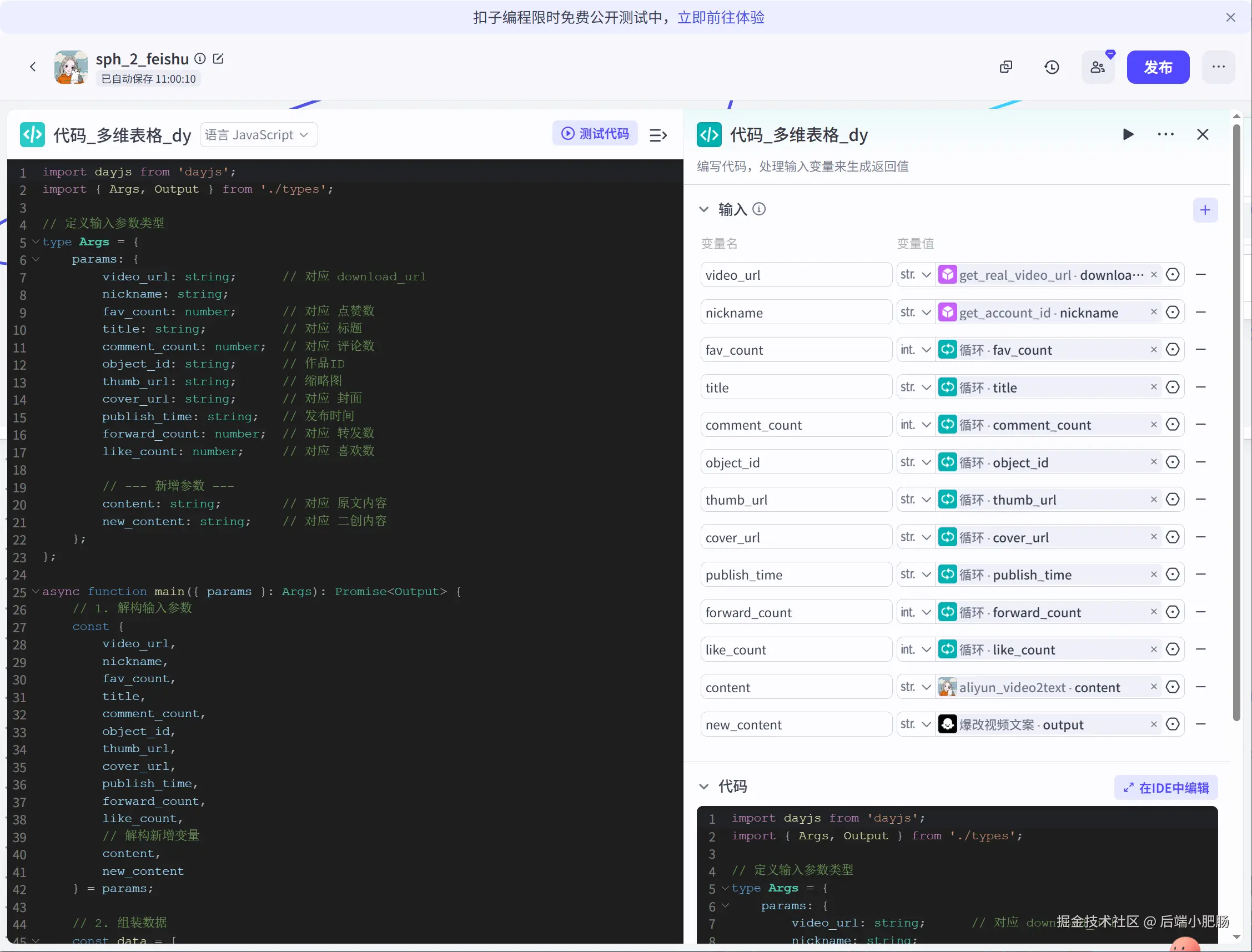 代码(规整获取的作品数据): 这是一个代码节点,它的作用是规整作品数据,输出规则的对象数组。如下图所示,我将标题、评论数、发布时间等核心属性进行了拼接整合,输出为规则的对象数组,方便后续处理。