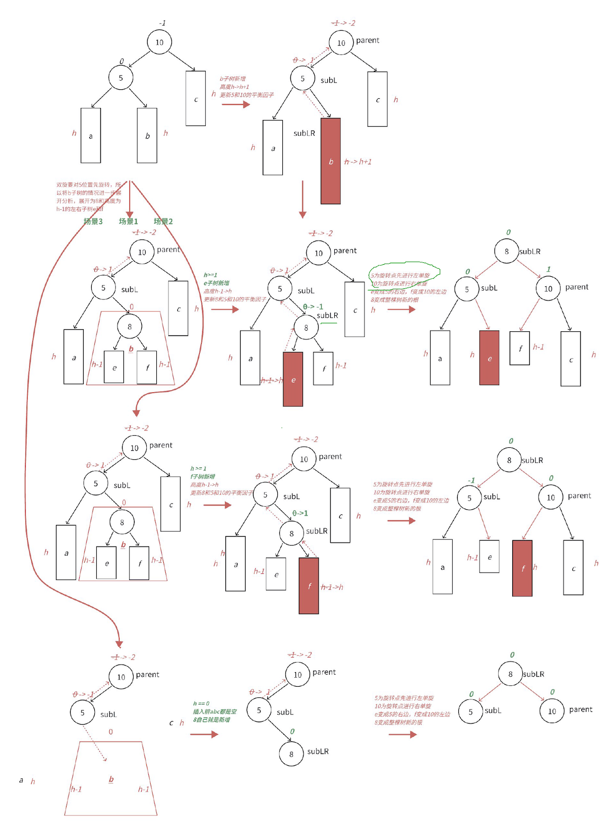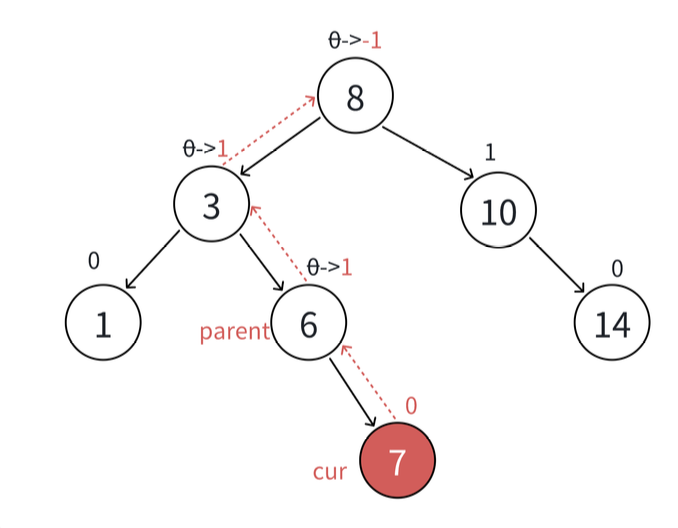 插入结点,会增加高度,所以新增结点在 parent 的右子树,parent 的平衡因子++,新增结点在 parent 的左子树,parent 平衡因子--。