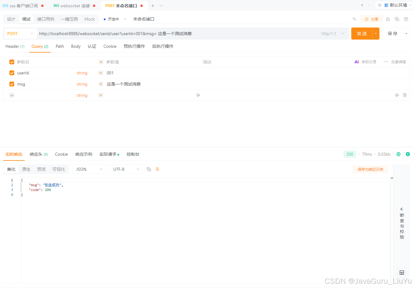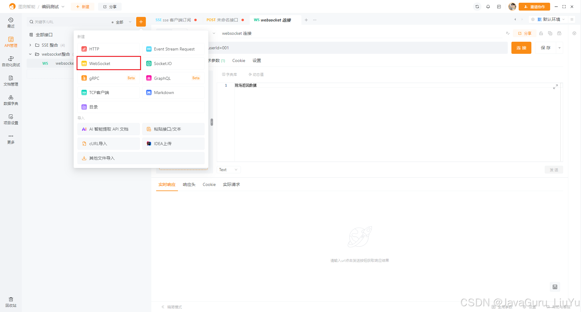 我这里使用的是 ApiPost 软件进行测试,记住新建 WebSocket 进行连接。