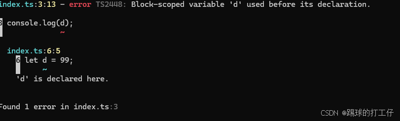 可以看到在var之前进行console.log是可以输出的,只不过值是undefined,因为var声明的变量会提升到当前作用域的顶部,而let声明的会在编译的时候报错!