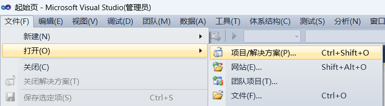 打开了 VS2010 以后,请依次点选【文件】,【打开】,【项目/解决方案】菜单命令,过程如下面的几张截图所示。