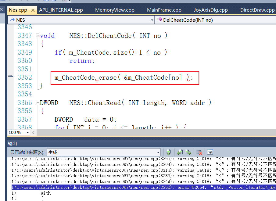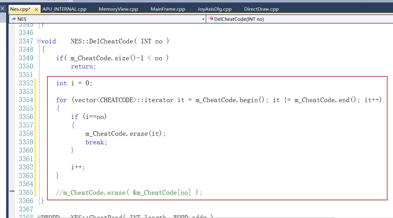 错误代码行位于 NES::DelCheatCode 函数之中。我们将图35 中,用红色框线标注出来的错误代码行,替换为下图所示的代码。