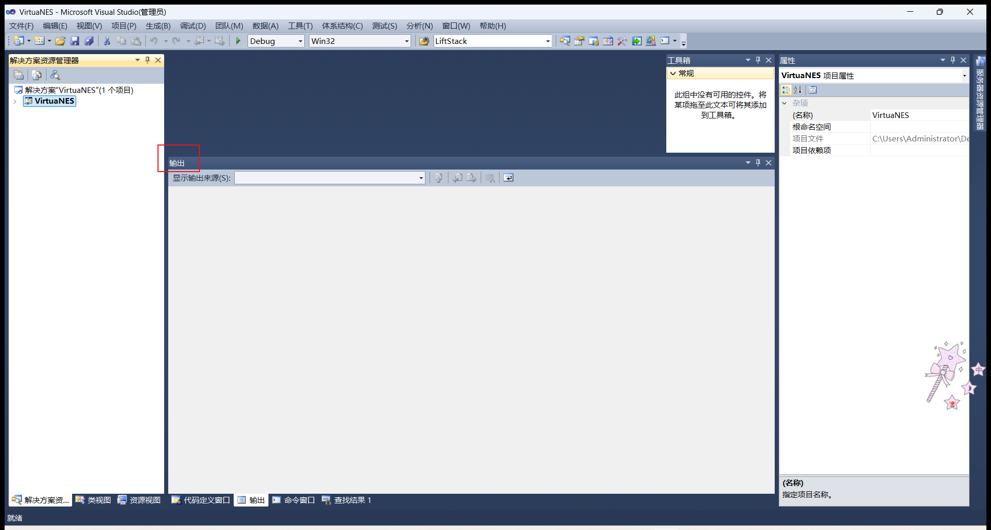不过,在编译项目之前,我们还是先来做一个准备工作,那就是将【输出】窗口给拉高一些。