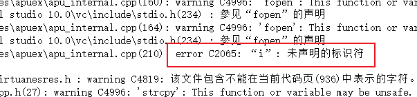 又是【未声明的标识符】错误,且还是变量 i 的问题。不过,这次,是出在其它的 cpp 文件上。我们还是将鼠标指针移动到 error 字样的区域中,然后双击。然后呢,VS2010 会打开错误代码所在的文件以及错误位置,结果如下图所示。