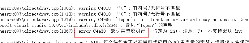 1>c:\users\administrator\desktop\virtuanessrc097\directdraw.cpp(1367): error C4430: 缺少类型说明符 - 假定为 int。注意: C++ 不支持默认 int