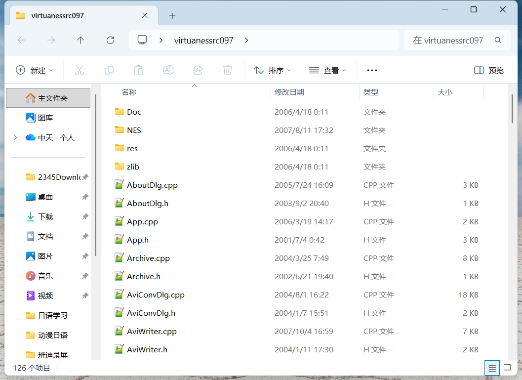 VirtuaNES 模拟器项目代码,应该是一个日本人开发的。因为,里面的好多的代码注释,都是用日语写的。本次,我们使用右边的红色框线所示的那个代码包。请将其下载下来,比如说下载到桌面,然后将其解压缩,然后呢,进入到解压缩之后的文件夹里面,结果如下图所示。