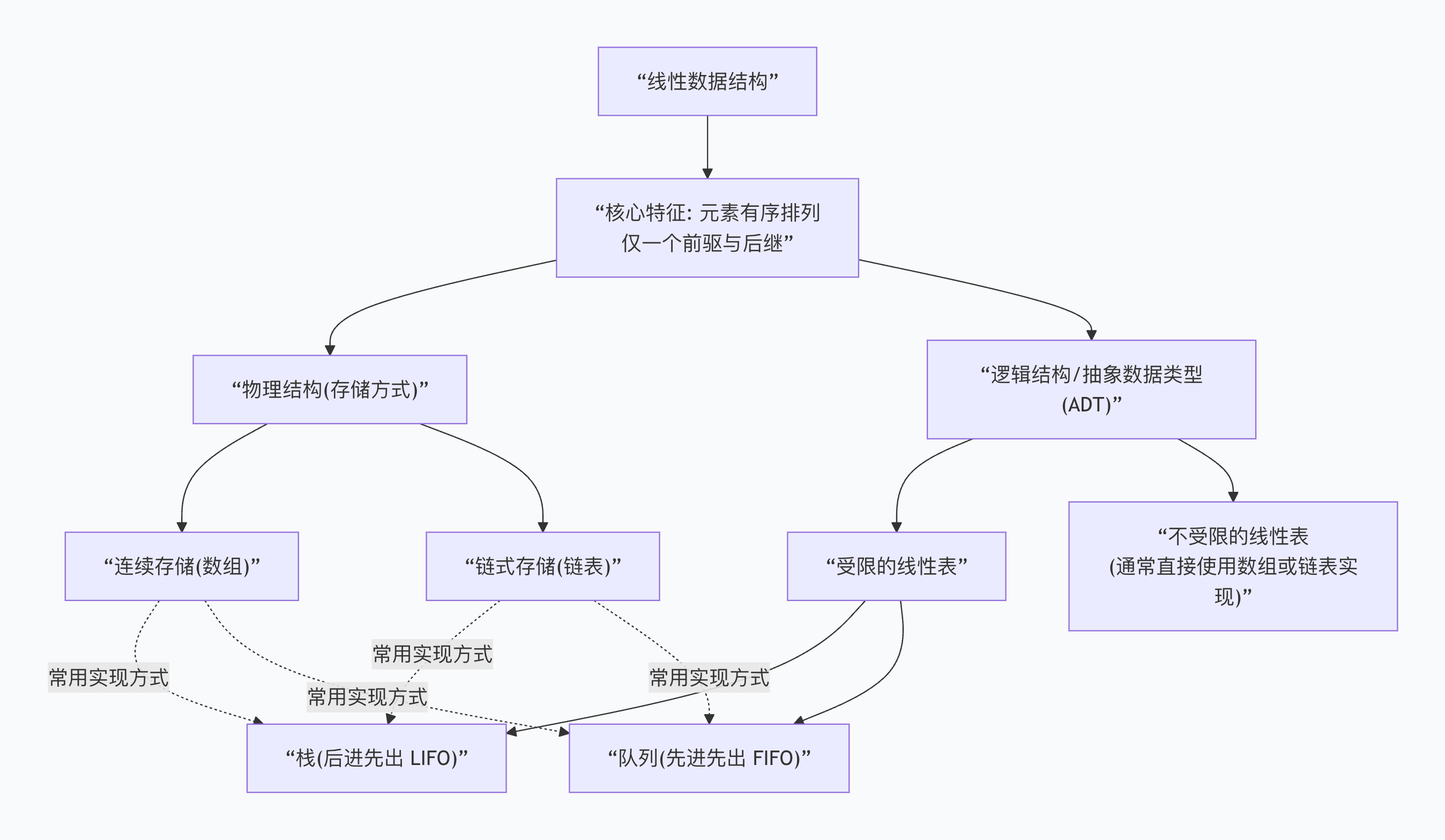 | 栈 | LIFO,仅在栈顶操作 | 逻辑模型,常由数组或链表实现 |