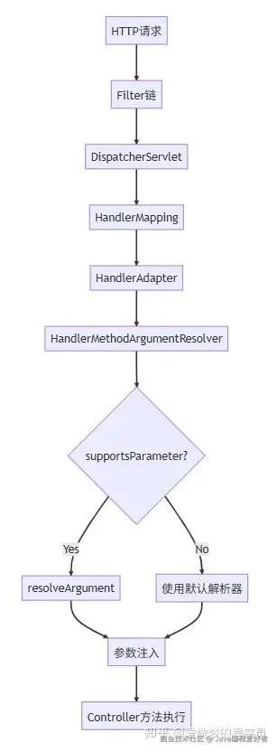 在这个流程中,Spring MVC 会按照注册的顺序遍历所有的 HandlerMethodArgumentResolver,对于每个需要解析的参数,都会调用 supportsParameter() 方法判断是否支持,如果支持则调用 resolveArgument() 方法进行实际的参数解析。