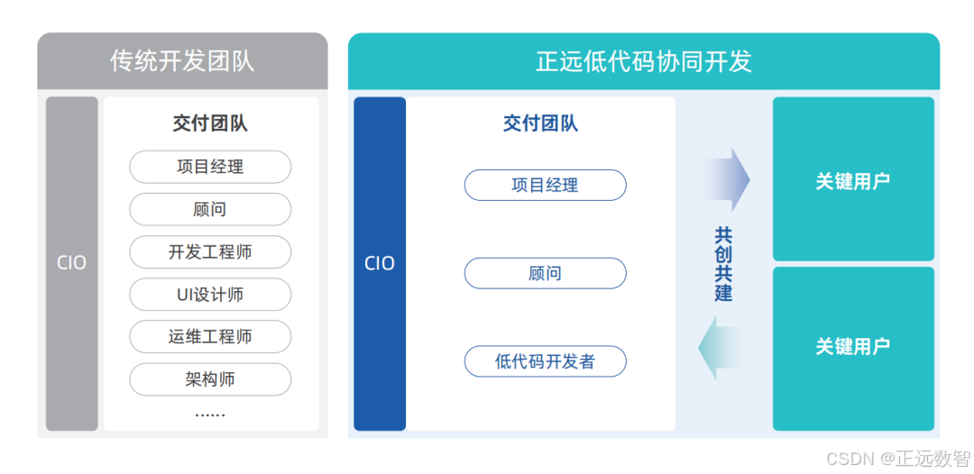 正远低代码平台通过颠覆性地降低开发门槛,直接冲击了这一高昂的成本结构。它改变了开发团队的构成,提出了一种全新的协作模式:一个由10名专业人员组成的传统IT团队,其生产力可以被一个由2名低代码开发者与业务关键用户紧密协作的小型团队所取代。这种模式能够将开发成本降低70%。